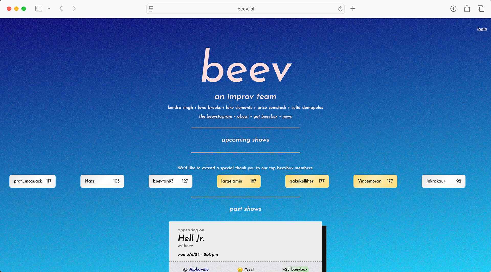 Performer and producer on beev, an improv team with over 30 shows at venues like Caveat, BCC, and The PIT